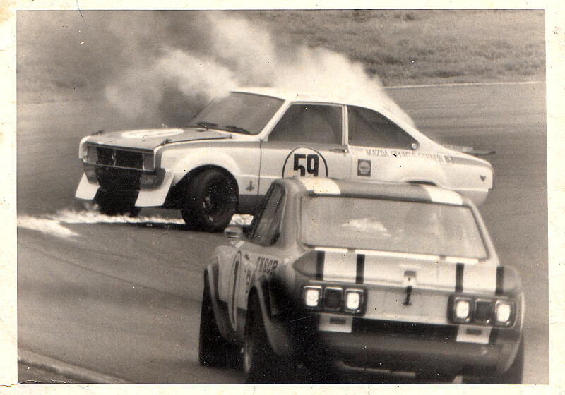 おカネが無くて白黒写真だったのがちと残念だが、状況を説明させていただくと59番のロータリークーペがヘアピン手前のブレーキング時にアフターファイアで漏れていたガソリンに引火、コースど真ん中で炎に包まれてストップ。