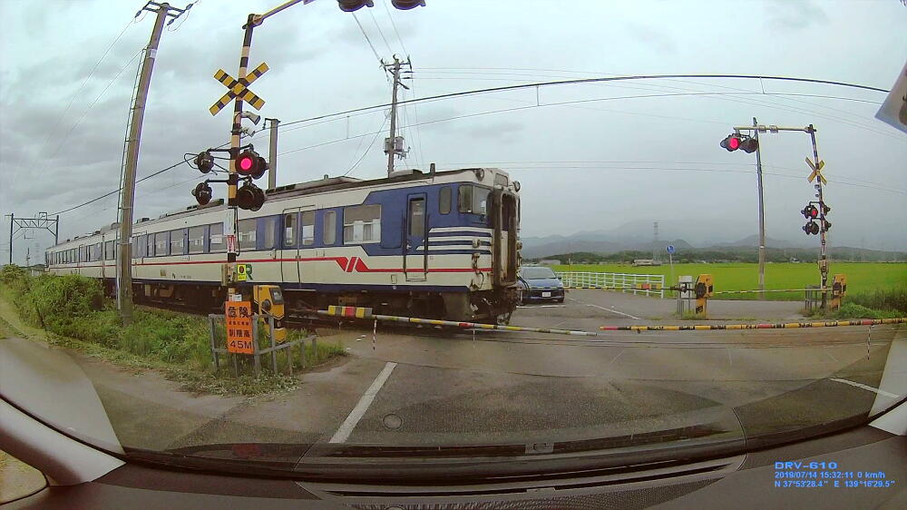 途中、踏切の遮断機が直前で下りたので、どんな鉄道車両が通過するのか少しワクワクしながら待っていると―――