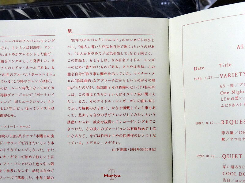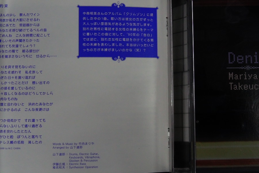 そして何よりもガッカリさせられたのが、このアルバムのライナーノーツに書かれたある文章(書いたのはダンナだが)。その内容については後述するが、それが原因でそれまでの「憧れの気持ち」が急速に冷めて行くのを感じ、やがて私は竹○ま△やを聴くことがなくなってしまったのである。