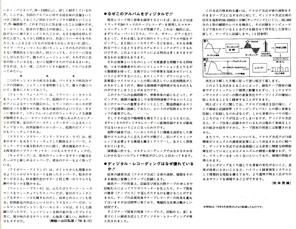 最後に、このアルバムでその演奏能力の高さと人間性の大きさを存分に発揮している「世界一のハーモニカ奏者」トゥーツ・シールマンスは2016年8月22日に、そしてこのアルバムのリーダー的存在だった松岡直也は2014年4月29日に、さらにこのアルバムで見事なギタープレイを披露してくれている松木恒秀も2017年6月18日に、それぞれ惜しまれつつ他界してしまっている。