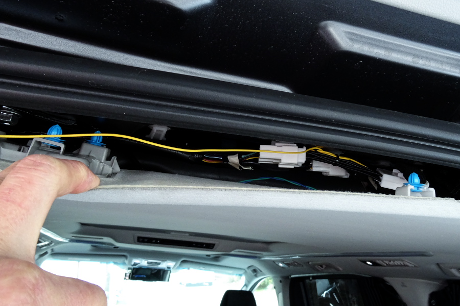 まずはバックドア前のルーフを剥がし、そこにあるカプラーにこの製品を割り込ませる。