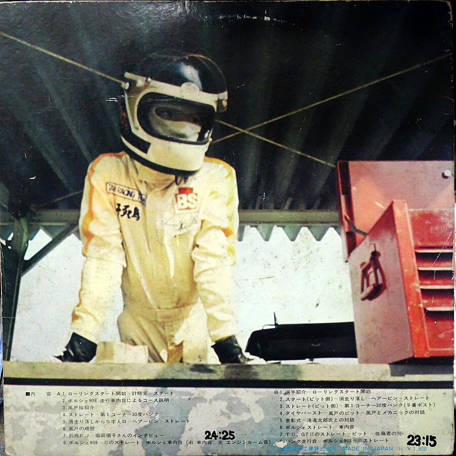 そしてこのLPの主役は何と言ってもレーシングカーの走行音だと思うが、風戸が操るポルシェ908がFISCOを走行する車内音は、いかにも空冷らしい「昔のポルシェサウンド」という感じで、シフトダウン時のヒール&トーの音や、割とのんびりとしたシフトアップの様子など、今のレースシーンでは聴くことの無くなった懐かしい音である。
