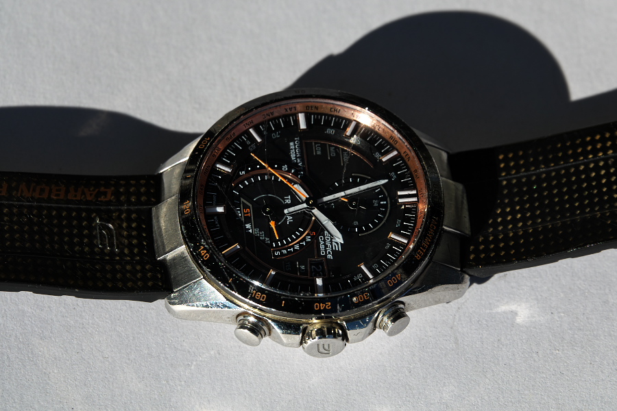 CASIOのEDIFICEってやつ。アナログ、電波時計、タフソーラー充電で条件をすべてクリアしているが、買ってからもう5年くらい経過していて、仕事でも使っているのでキズだらけになっちゃってるし、カーボン入りの樹脂バンドが硬くなってきたのでそろそろ買い替え時って感じ。