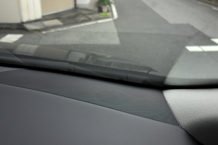 ↑ダッシュボード前端の左右に埋め込まれた8cmミッドレンジ/ツィーター。う~ん、この位置はフロントガラスの反射があってチューニングが難しいはず。
