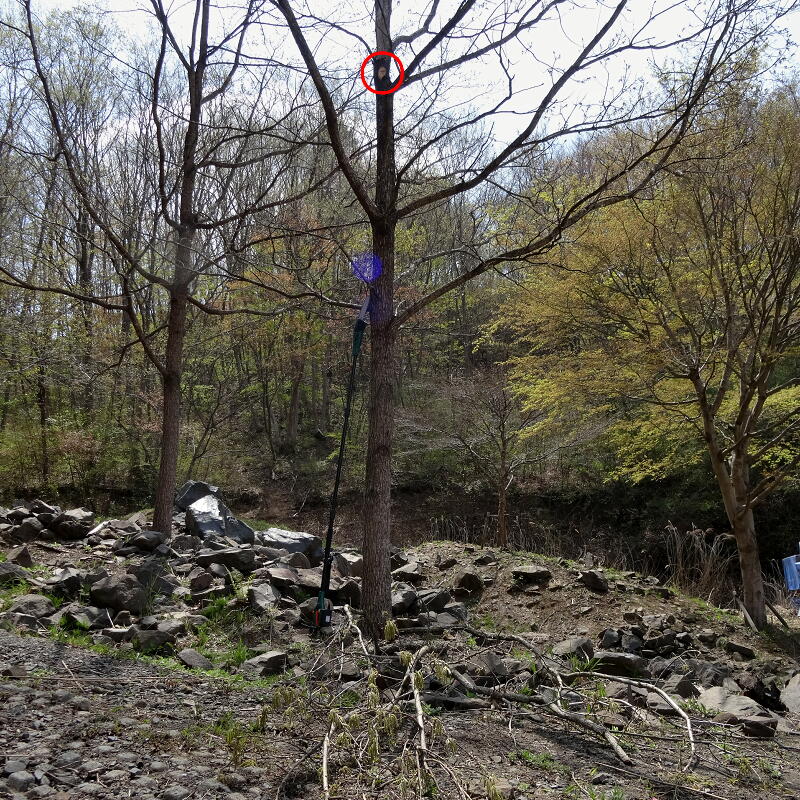 ↑切断完了後の画像。赤丸が切断した根元だけど、4m以上の高さにあって、木の左の少し高い場所に立って思いっきり手を伸ばして、全長2.8mのこの高枝切りチェーンソーがギリギリ届く位置。