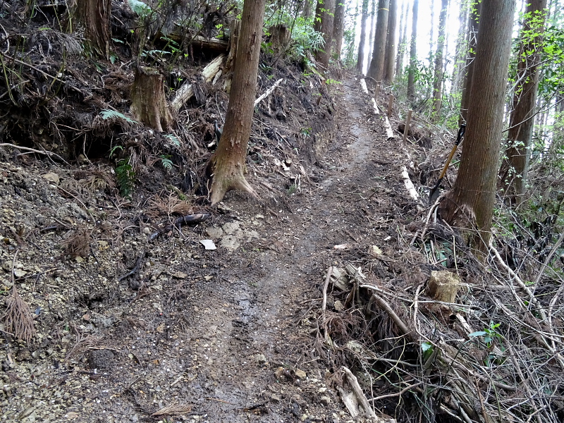関東選手権前日の夕方になって、この日走ったオフィシャルさんに路肩を崩された(笑)ことに気付き、慌てて谷側に丸太を入れて土を盛る作業を暗くなるまで行なったおかげで、大会当日に延べ200台以上のバイクが走ったにもかかわらず、このとおりちゃんと道としての形を残しておりました。