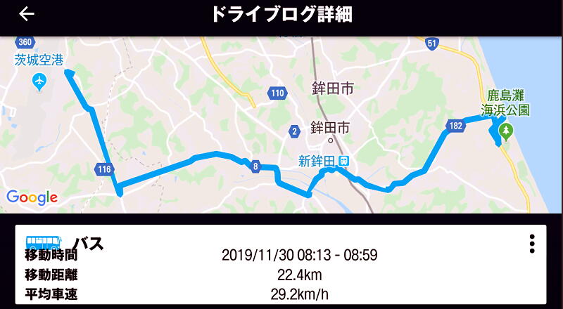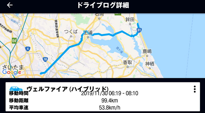 今回のGPS軌跡をスマホの「e燃費」アプリのドライブログで見るとこんな感じ↓