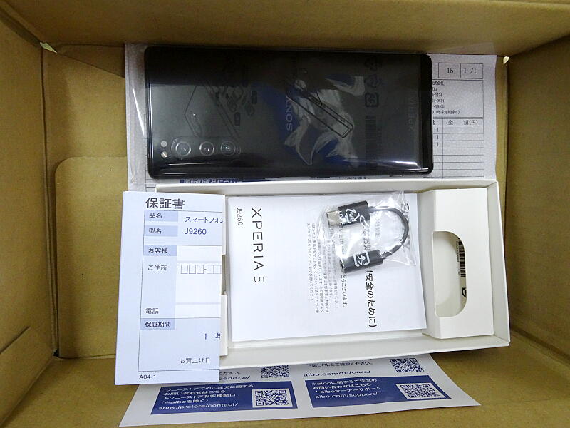 まあ事前に調べてわかってはいたのだけど、付属品は「USB-Cタイプ→イヤホンジャック変換ケーブル」のみで、充電器等は一切付属なし。