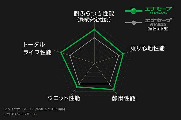 この「ENASAVE RV505」はミニバン用エコタイヤということで、転がり抵抗性能が AAグレードとなっている他、耐ふらつき性能や静粛性なども従来品より向上しているらしい。