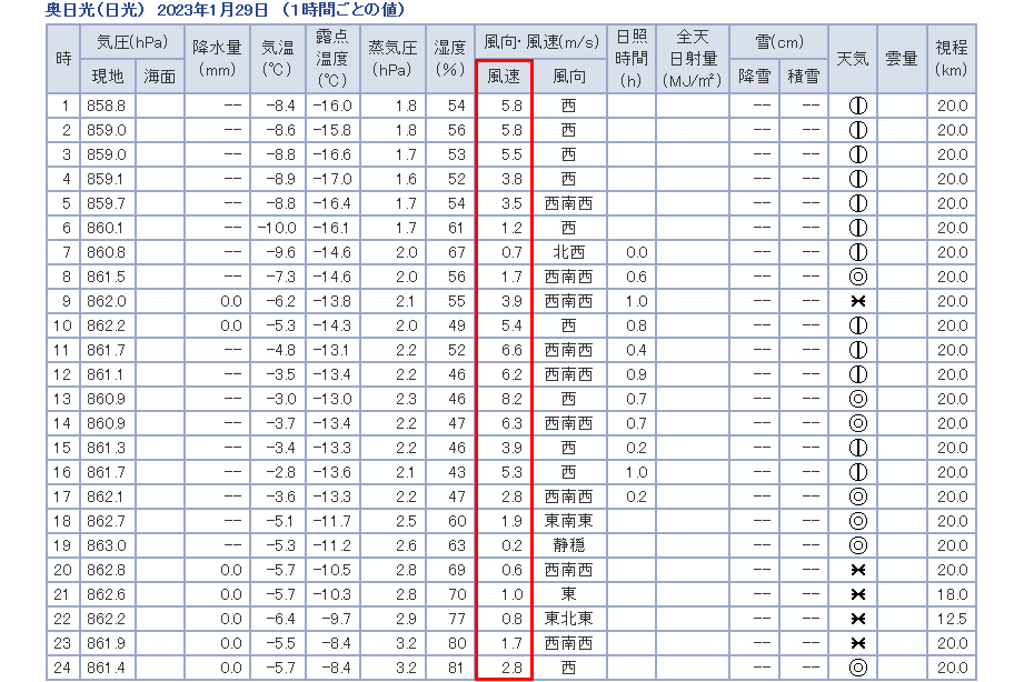 歩き始めの10時頃から5m/s以上の強めの風が吹き、昼休みをとった13時には8.2m/sという強風を記録している。