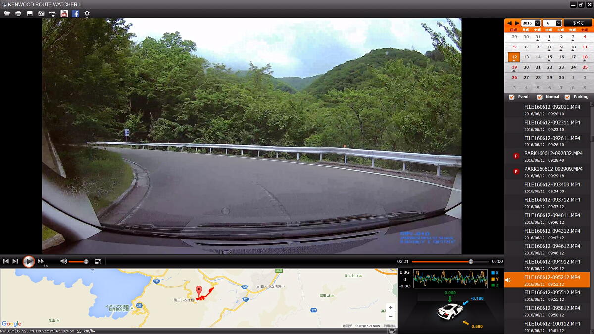 Googlemap上にGPS軌跡が表示され、その右には3軸加速度センサーの数値も表示される。
