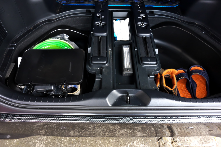 左側のスペースはすでに「ガラクタ置き場」と化しておりますが、右側のスペアタイヤが入るスペースは余裕たっぷり。まだまだブーツとかもたっぷり収容できる状態です。