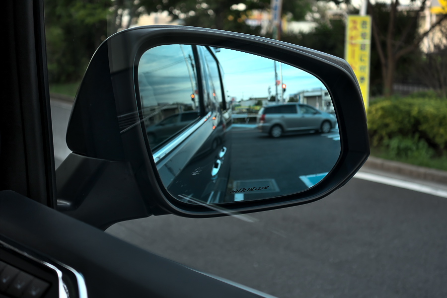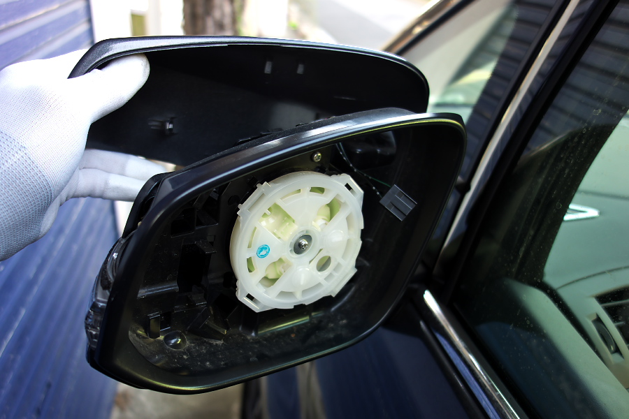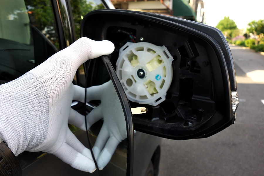 まずはノーマルのミラーを取り外すのだけど、これはミラーをグッと下を向くように押して、上にできた隙間に指を突っ込んで「バリッ!!」とはがすという「力技」で簡単に外すことができた↓