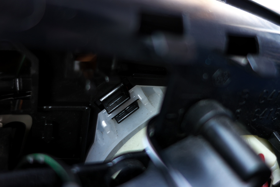 で、LED付ミラーを取り付ける際は、4か所あるツメの位置を合わせて「力技」でバキッと嵌め込むんだけど、裏側から一か所のツメが見えるので、その位置を合わせて「バキッ」とすればOK↓
