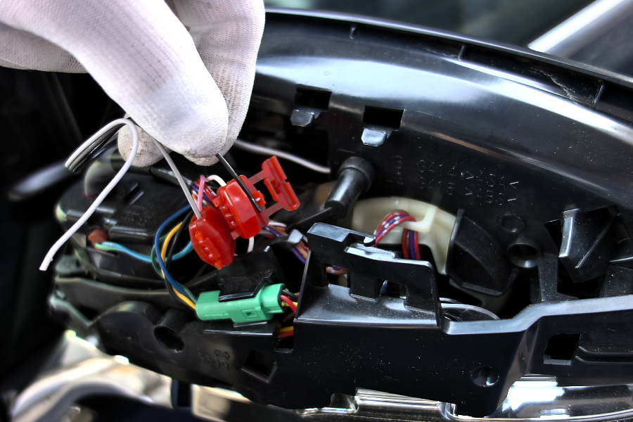 で、あとは付属のエレクトロタップを使って、取説に記載の配線に接続するんだけど、この際LED付ミラーから来ている3本の線のうち、どの2本に繋ぐかによって「ただの点滅」と「フロー点滅」を選択できる仕組みになっている。