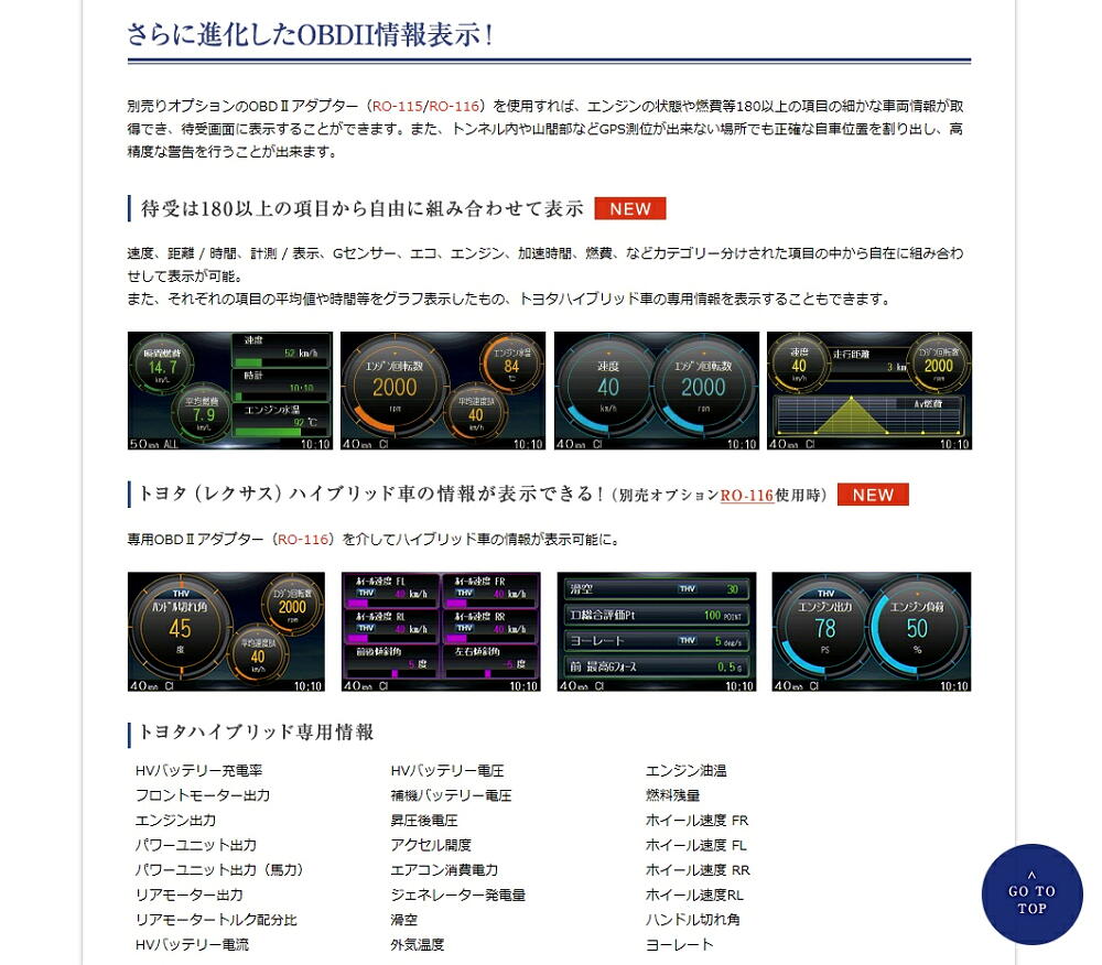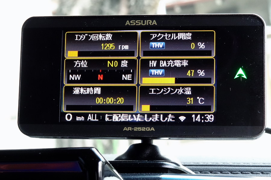 このAR-252GAっていうレーダー探知機は、OBDから取得したデータを元に、180種類以上もの項目から選んで待受画面に表示することができるんです↓