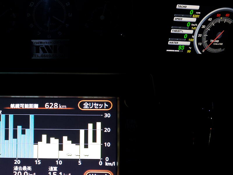 先代アル様の時のレーダー探知機はOBD接続ではなかったので、それとは別にOBDからデータを取って表示するこんなメーターを付けていました↓