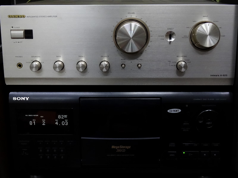 で、この記事を書くことを思いついた私は、A-925をCDプレーヤー・CDP-CX200Fの上に置いて写真を撮ったのだが、撮影後もこの場所が収まりがよく邪魔にもならないので、この場所が壊れたA-925の置き場所となってしまった。
