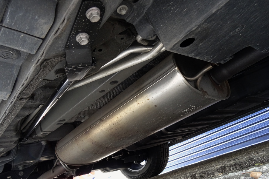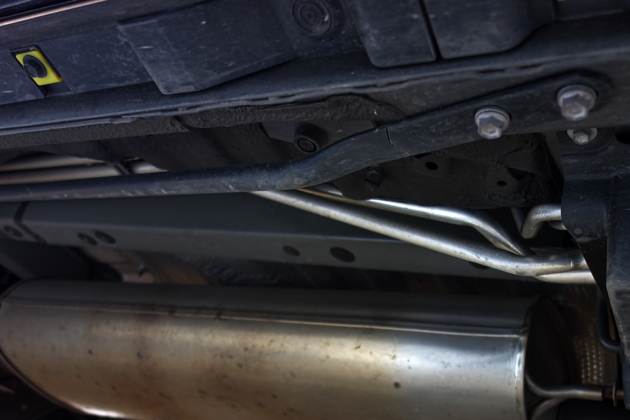 ↑これが標準装着のブレース(2本のボルトで固定されているパイプ)。TRDのスペシャルサイトによると、ドアスタビライザーのみの装着ではステアリング特性が悪化したようなことが書かれていたが、ドアスタビライザーのくさび効果により全体の剛性バランスが大きく変化することは容易に想像できる。