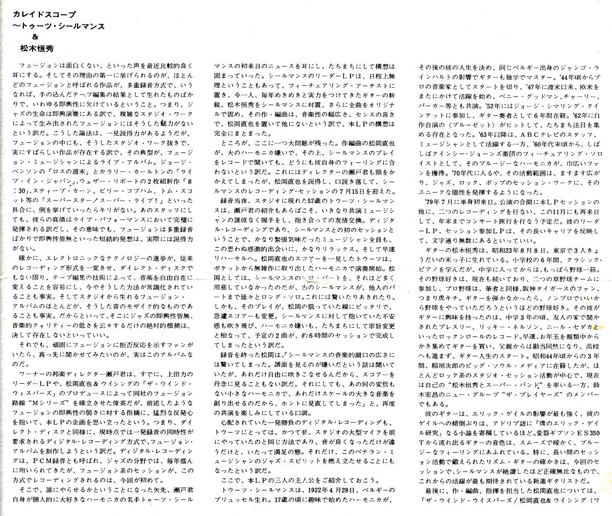 「松岡直也フィーチャリングトゥーツ・シールマンス&松木恒秀/KALEIDOSCOPE」―――ジャンルでいうと「ジャズ・フュージョン」になるが、このアルバムと私の出会いは、1979年にアナログ盤でリリースされた当時まで遡る。