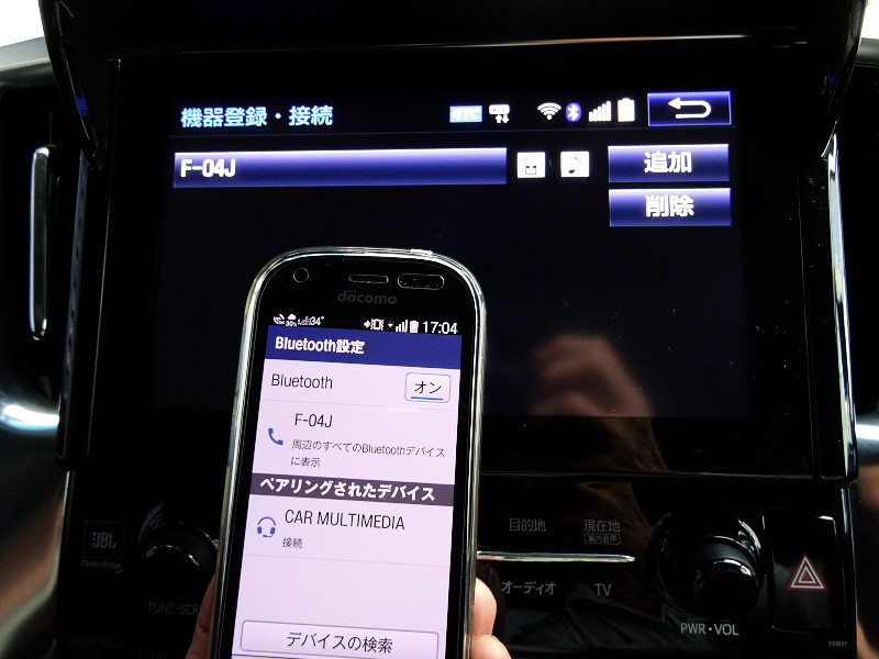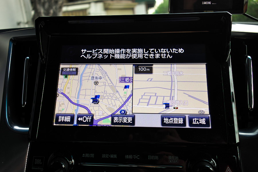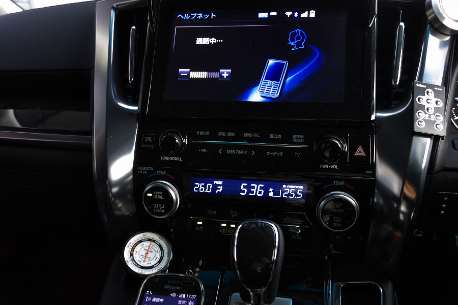 ‥‥‥というわけでナビ様とスマホの接続がすべて完了。ナビ様の画面最上段にはヘルプネットの呼び出しボタン(これを押すとすぐに救急車を手配してくれるワケね)、Bluetoothのマーク、携帯の電波状況を示すマーク、さらにはスマホのバッテリー残量を示すマークまで表示されてますね(^^)v。これでナビ様の機能はほぼすべて使えるようになりました。
