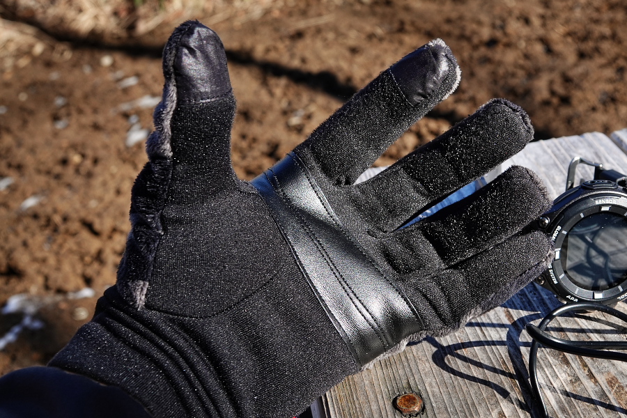人差し指と親指の先の部分が特殊な繊維?になっていて、着用したままでタッチパネルが操作できる優れもの。生地も厚過ぎず保温性も充分で、カメラの操作もしやすかったですね。