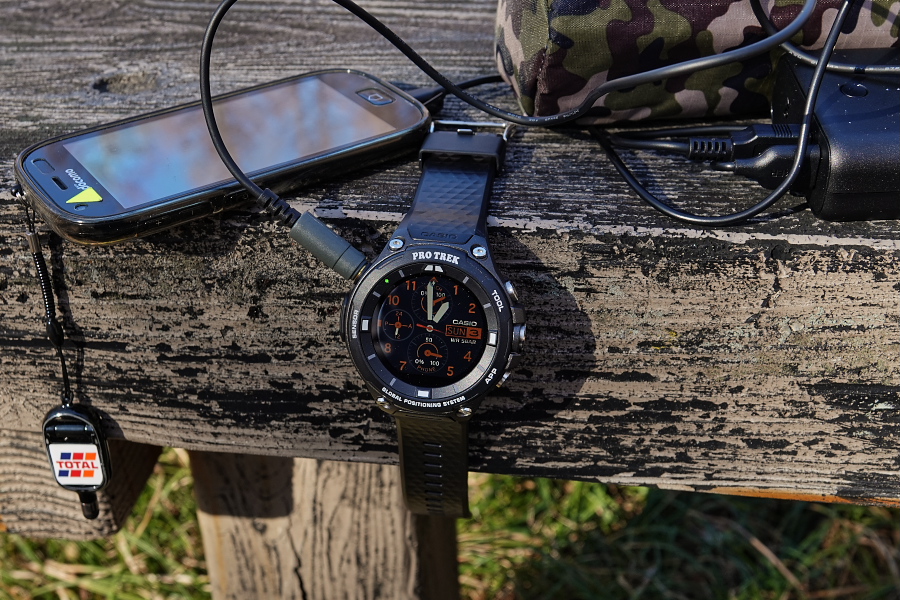 15分で昼食を終えると、WSD-F20は充電ランプが黄色になって充電完了。このウォッチフェイスは自分バッテリー残量と、ペアリングしているスマホのバッテリー残量をメーター表示してくれるので便利だ。スマホの方は下のメーターで表示されるが、残量90%くらいまで充電できている。