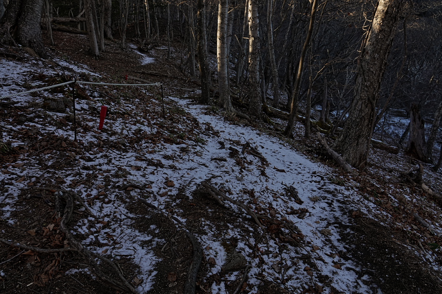 日の当たらない北側斜面に入ったので、雪が残っている。