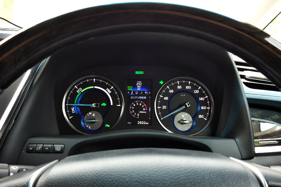 先代アル様の時は、エンジンがかかっているか止まっているかがとても判りにくかったので、OBDから取り出すメーターを後付けしてエンジン回転数を表示するようにしていたけど、ヴェル様はエンジンが止まるとメーターに「EV」インジケーターが点灯するし、メーター中央の「マルチインフォメーション」でタコメーターを表示することもできるから、これで問題なしだ。