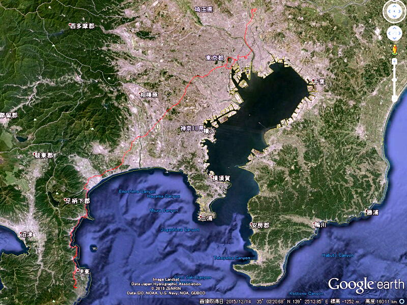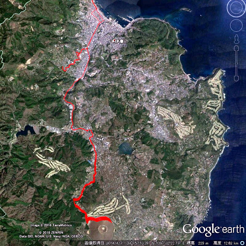 で、このレーダー探知機も当然GPS搭載なので、おまけとして走行ログ記録機能が付いてるので、前回の伊東行きの走行軌跡を見てみた↓