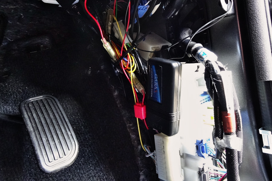 ↑アクセルペダル横のカバーを外した状態。GARAXのロゴ入りの黒いボックスがメインユニット。