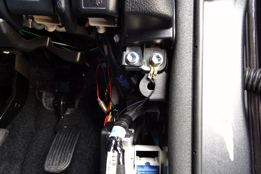 ↑アース線の締め付け位置だけど、メーカー動画では2個並んだ左側のボルトに締め付けていたので自分もその通りにしてたんだけど、よく見ると左のボルトはボディーアースしてない気がしたので、上の画像のように右側のボルトで締めるようにしてみたところ、バッチリ作動するようになってくれました(^_-)-☆