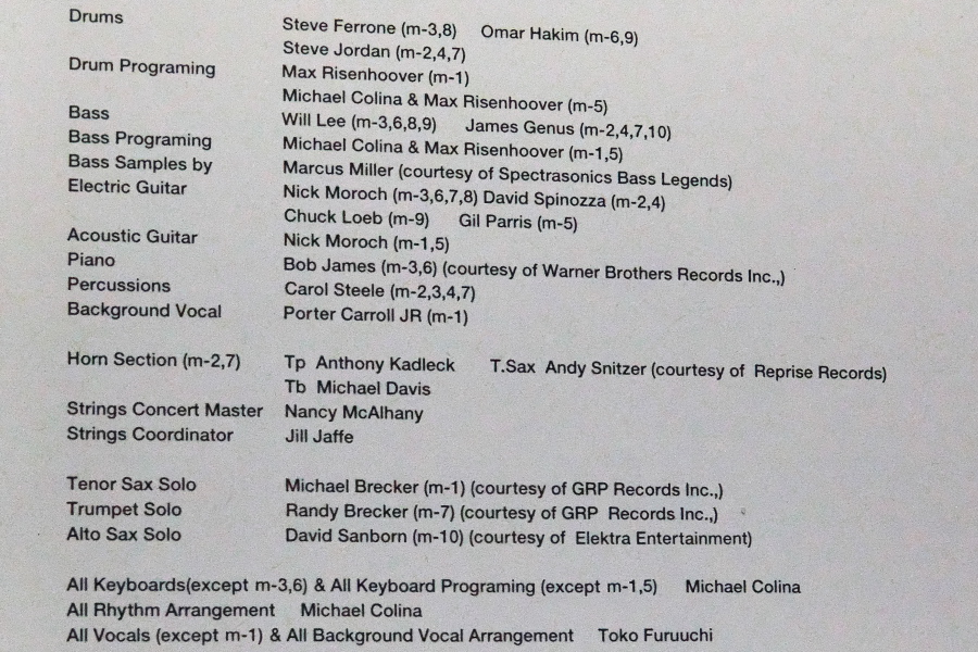 ↑CDのブックレットに並ぶ超一流ミュージシャンたちのクレジット。どれもすごい顔ぶれなのだけど、マイケル&ランディのブレッカー兄弟、デヴィッド・サンボーン、そしてキーボードの大御所ボブ・ジェームスまで――― これはもうバックの演奏だけでも絶対に聴く価値あり、って感じだ。