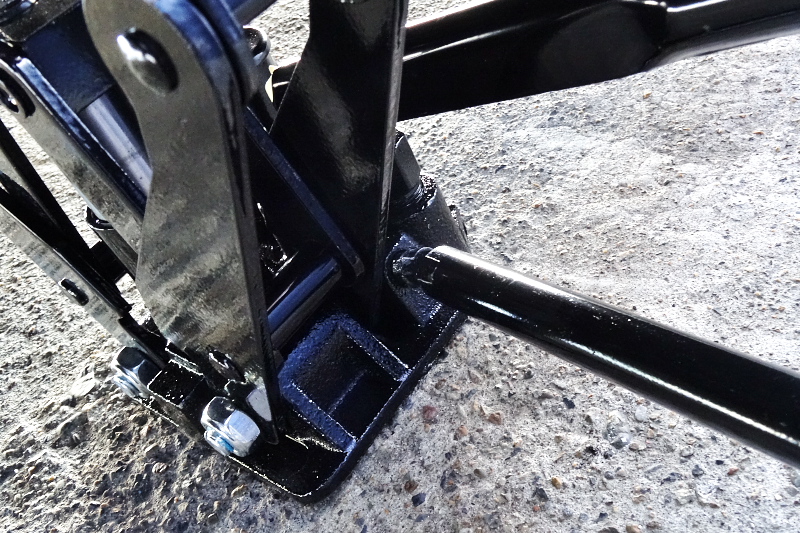 車載ジャッキと同じパンタグラフ式の油圧ジャッキ。車載のスクリュー式はフリクションロスも大きいし、特に高く上げた時はレバー比も立ち上がって来てスクリューを回すのにすごく力が要るけど、これは油圧ポンプのレバーを上下するだけで効率よくジャッキアップすることができるはず。