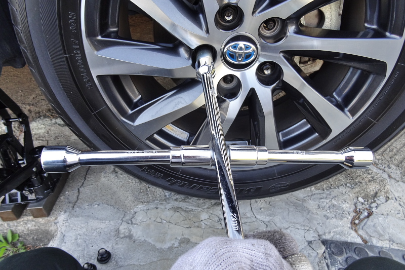 ついでにホイール交換の際にぜひ欲しい工具として、ホイールナット用のクロスレンチがある。