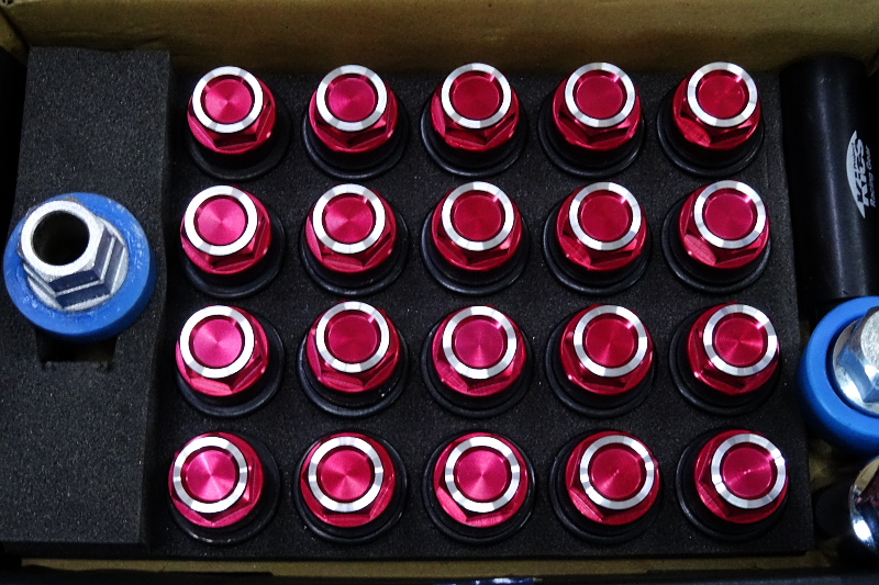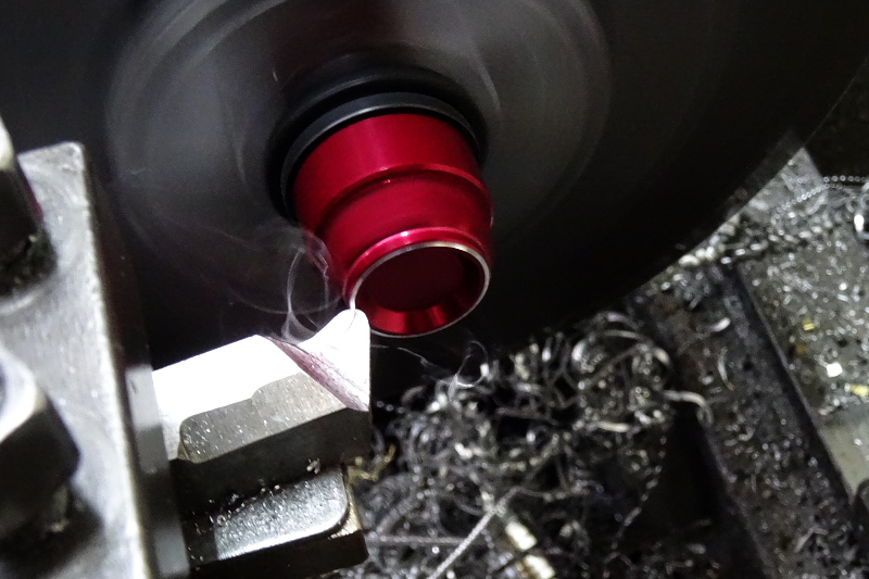 さて、これで夏タイヤへの交換は終了だが、以前ホイールスペーサーとセットで買ったナットのキャップの赤色がちょっと暗めなのが気になっていたので、旋盤で少し削って一部を光らせてみた。