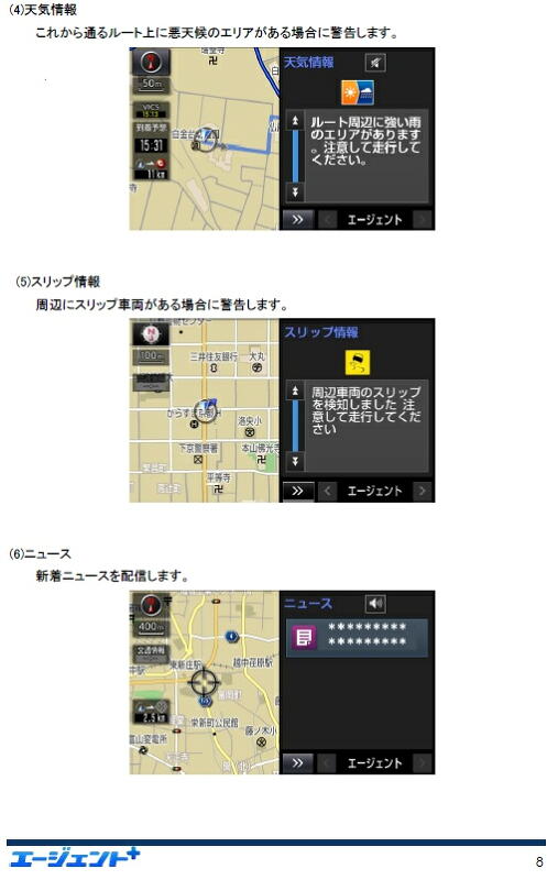 上のリンク先に書いてあるとおり、T-ConnectのAPPS(ナビ専用アプリ)の中の一つである「エージェント+」は、またの呼び名?を「先読み情報案内サービス」といい『これまでの走行履歴から行き先や経路を予測し、事故・渋滞・天候・残燃料等の案内をナビ画面に知らせてくれるサービスで、 目的地を設定しない「いつもの道」であっても、先回り予測して必要な情報を教えてくれるので、渋滞など不測の事態の回避につながります』だって。